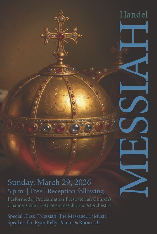 Proclamation's Chancel Choir, Covenant Choir, and soloists will perform Handel’s magnificent oratorio Messiah with orchestra on Palm Sunday, March 29, at 5 p.m. It is free and a reception will follow the concert.